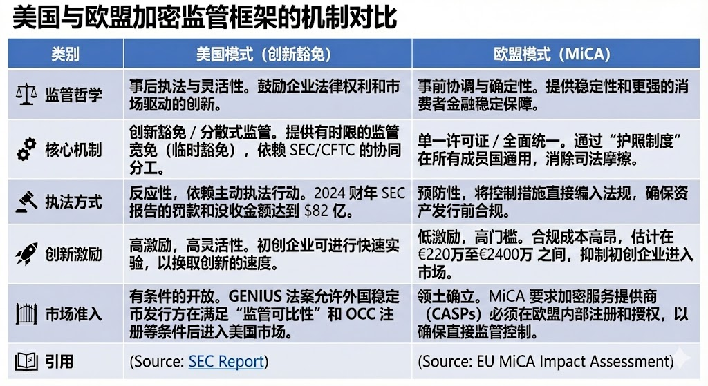 SEC 的创新豁免和更具弹性的美国模式,与欧盟的《MiCA》所代表的事前协调统一模式,形成了全球数字资产监管的两极,两者在哲学和操作层面上存在显著差异。