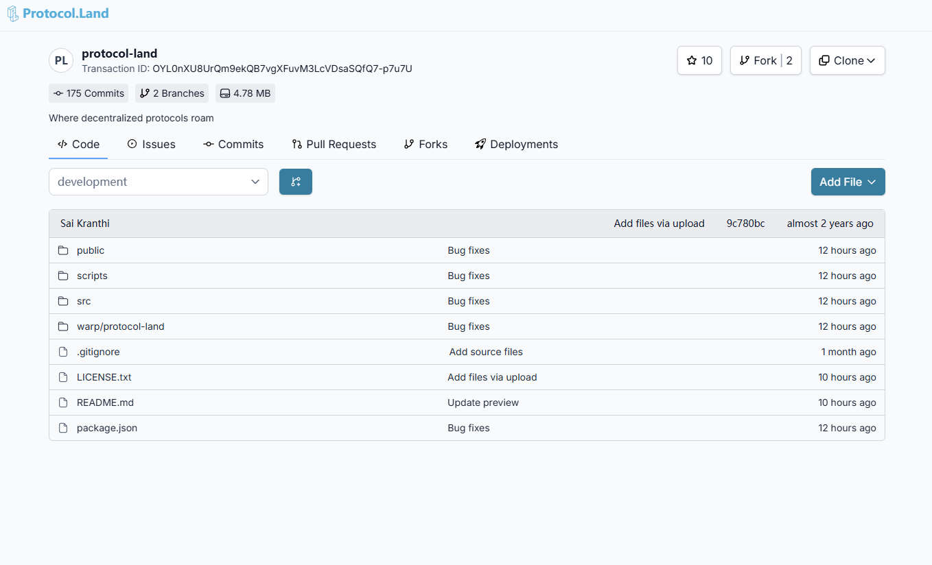它被 Arweave 公平分叉理念启发后,有了一个大胆的想法:让“去中心化”从头武装到脚。这个大胆的项目是Protocol.Land——Arweave 生态的去中心化源代码管理和代码协作平台,支持开发者在 Git 工作流中无缝使用,并将代码生成链上快照,永久存储到 Arweave。