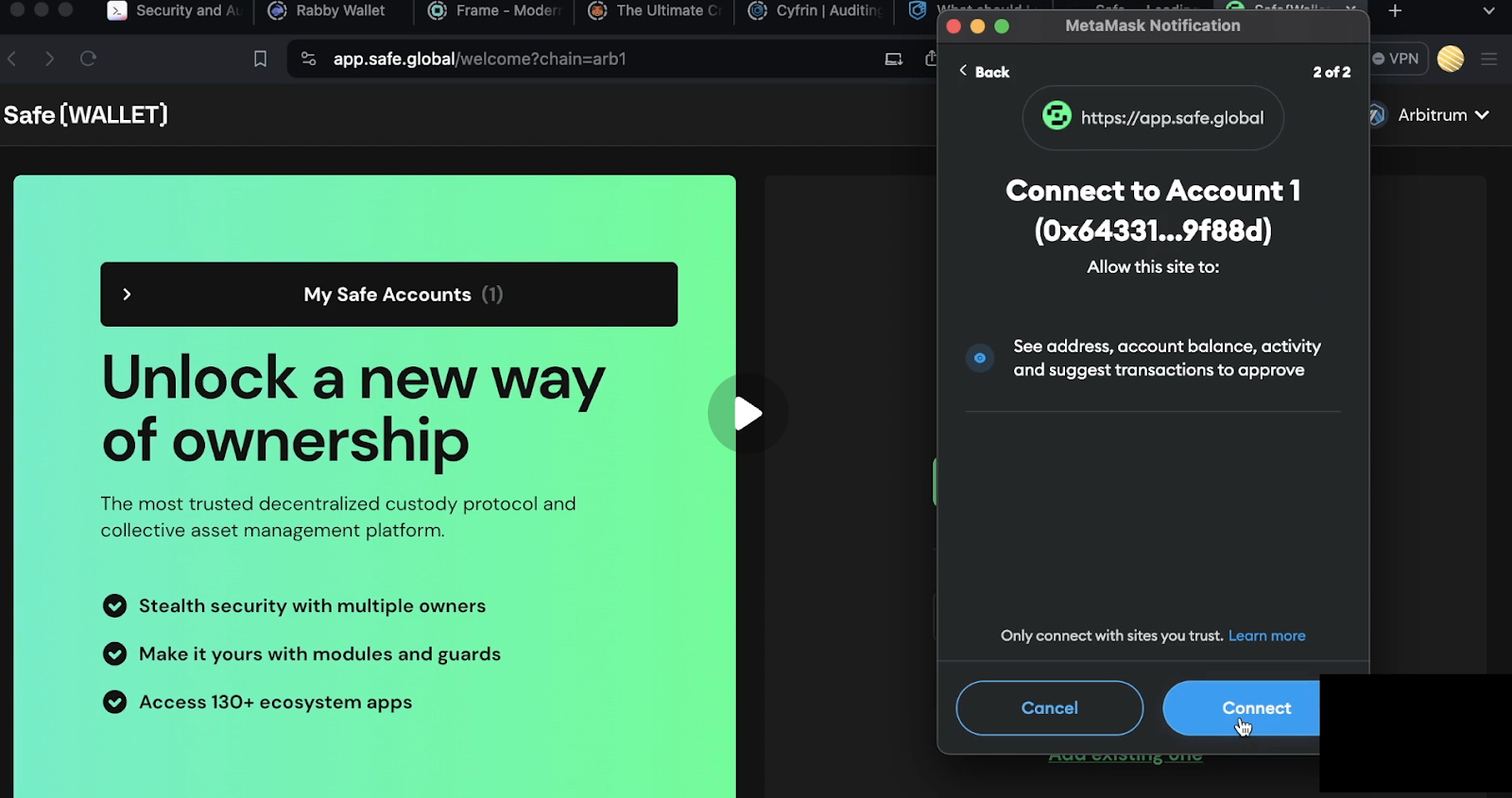3.连接你的钱包:选择要连接到 Safe 网站的钱包类型。本例中使用 MetaMask。