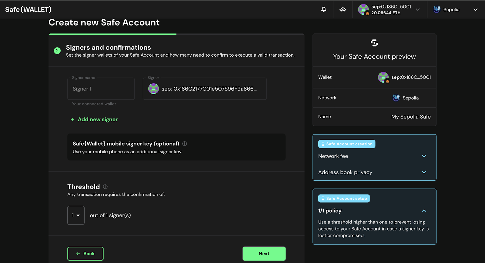 5.配置签名者:为简化操作,本指南将设置一个 1-of-1 的 Safe 钱包(即只需 1 个签名者即可批准交易)。但根据实际需求,更理想的安全配置可能是 2-of-3(3 位签名者中需 2 人批准)、4-of-7,甚至 8-of-9。