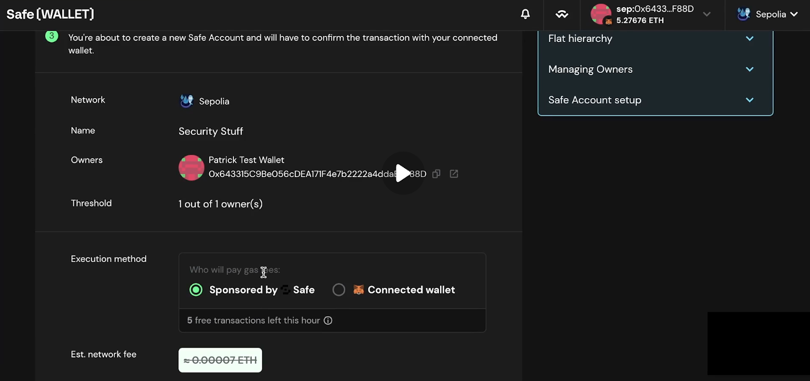 6.估算 Gas 费用:下一页将显示创建 Safe 钱包所需的 Gas 费。你可以自行支付,或在测试网上使用 Safe 提供的 Gas 赞助服务。在主网上创建“真实”Safe 钱包时,Gas 费必须由你自己承担。