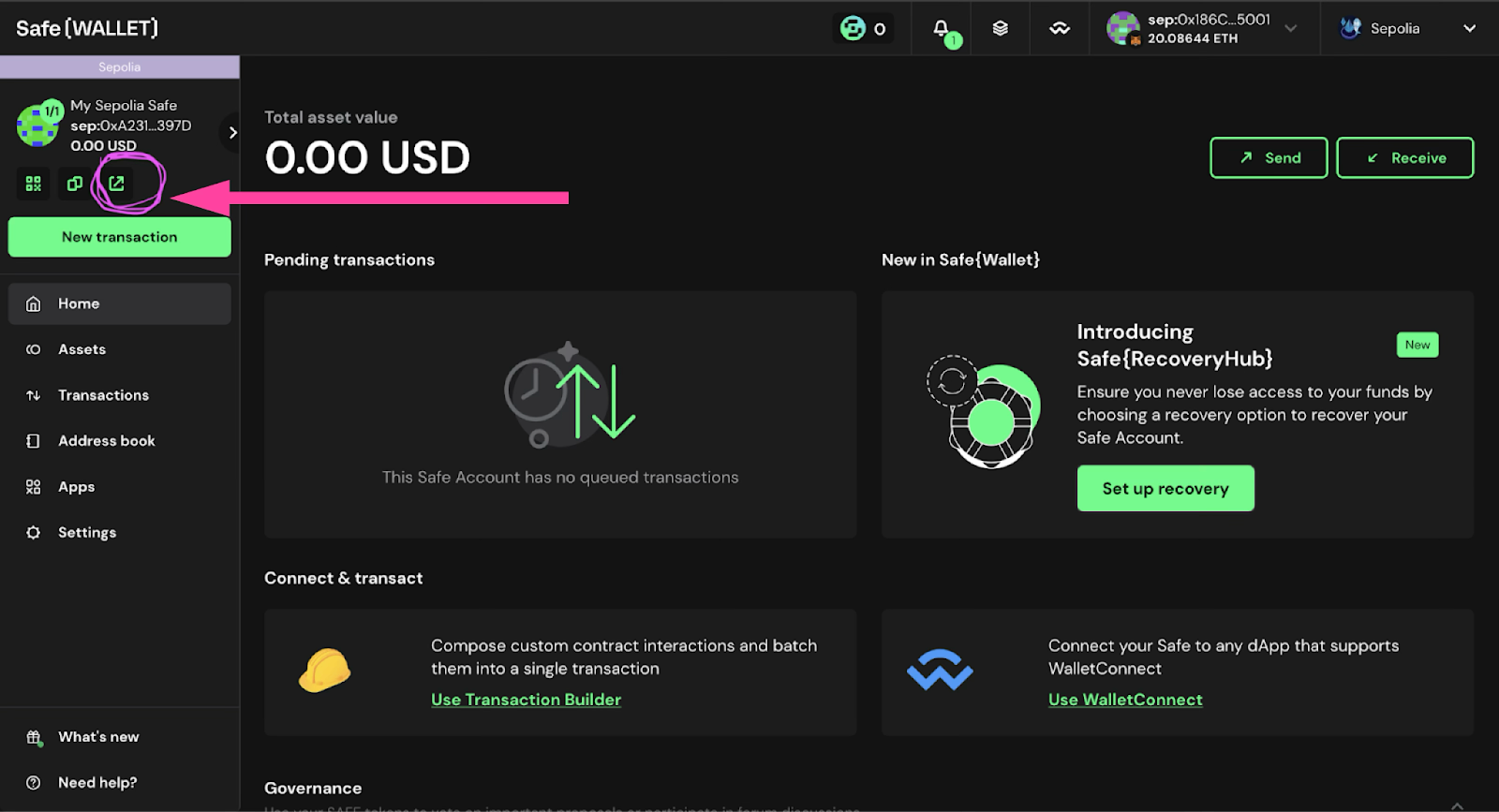 3.在 Safe 界面中点击下图红色圆圈标出的 WalletConnect 图标。