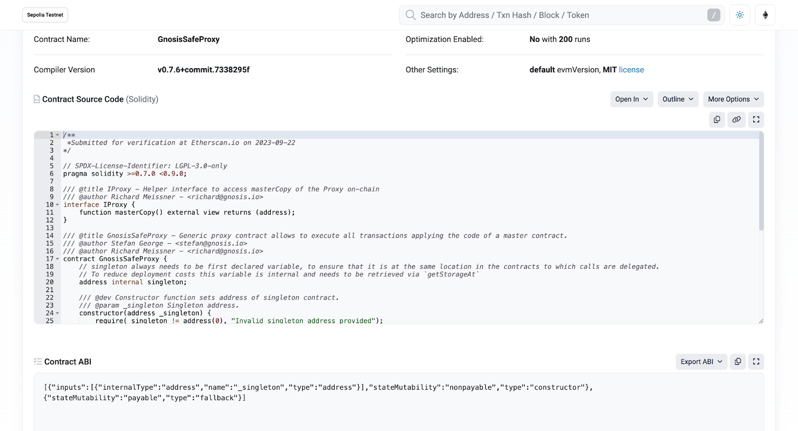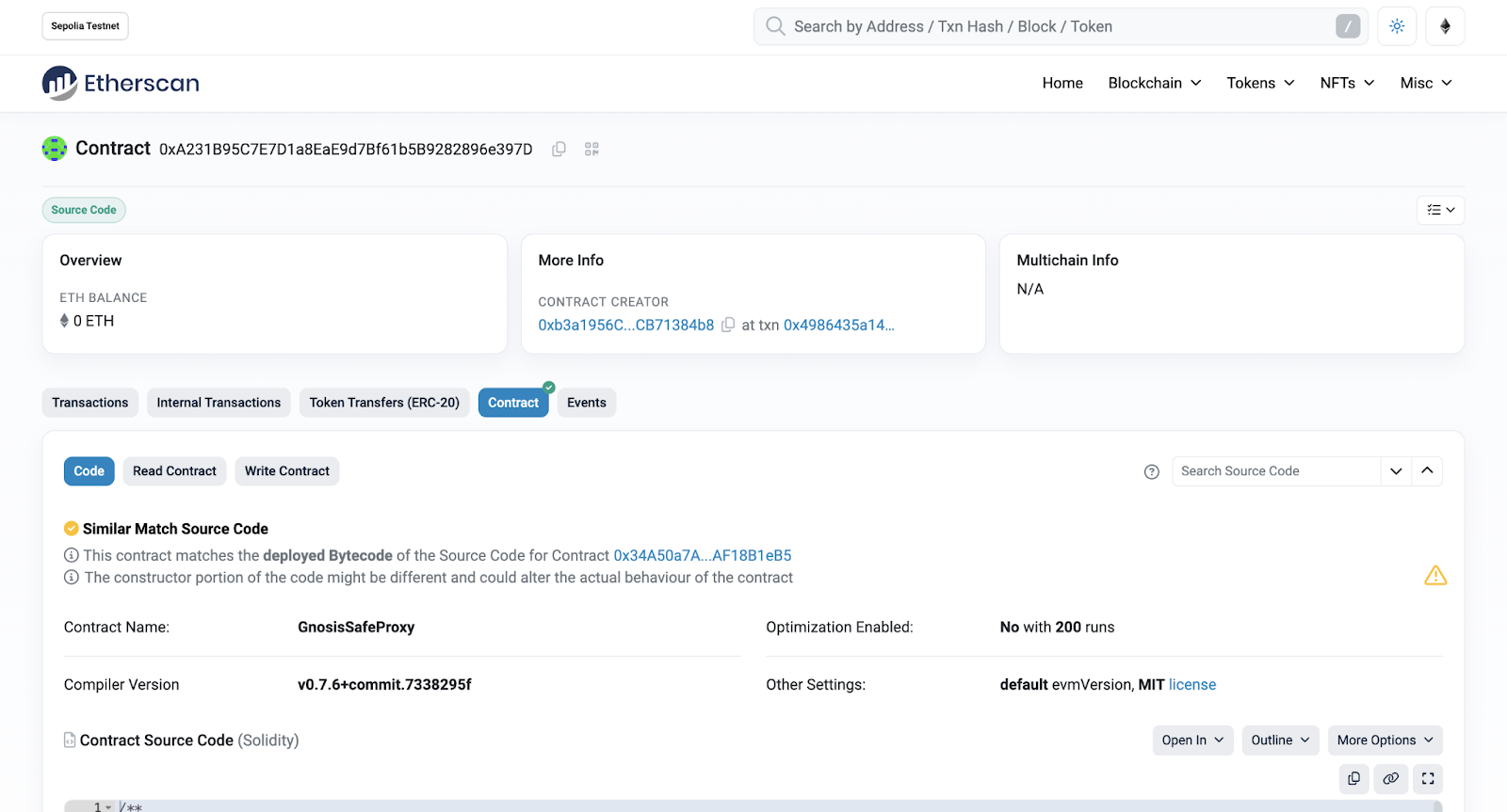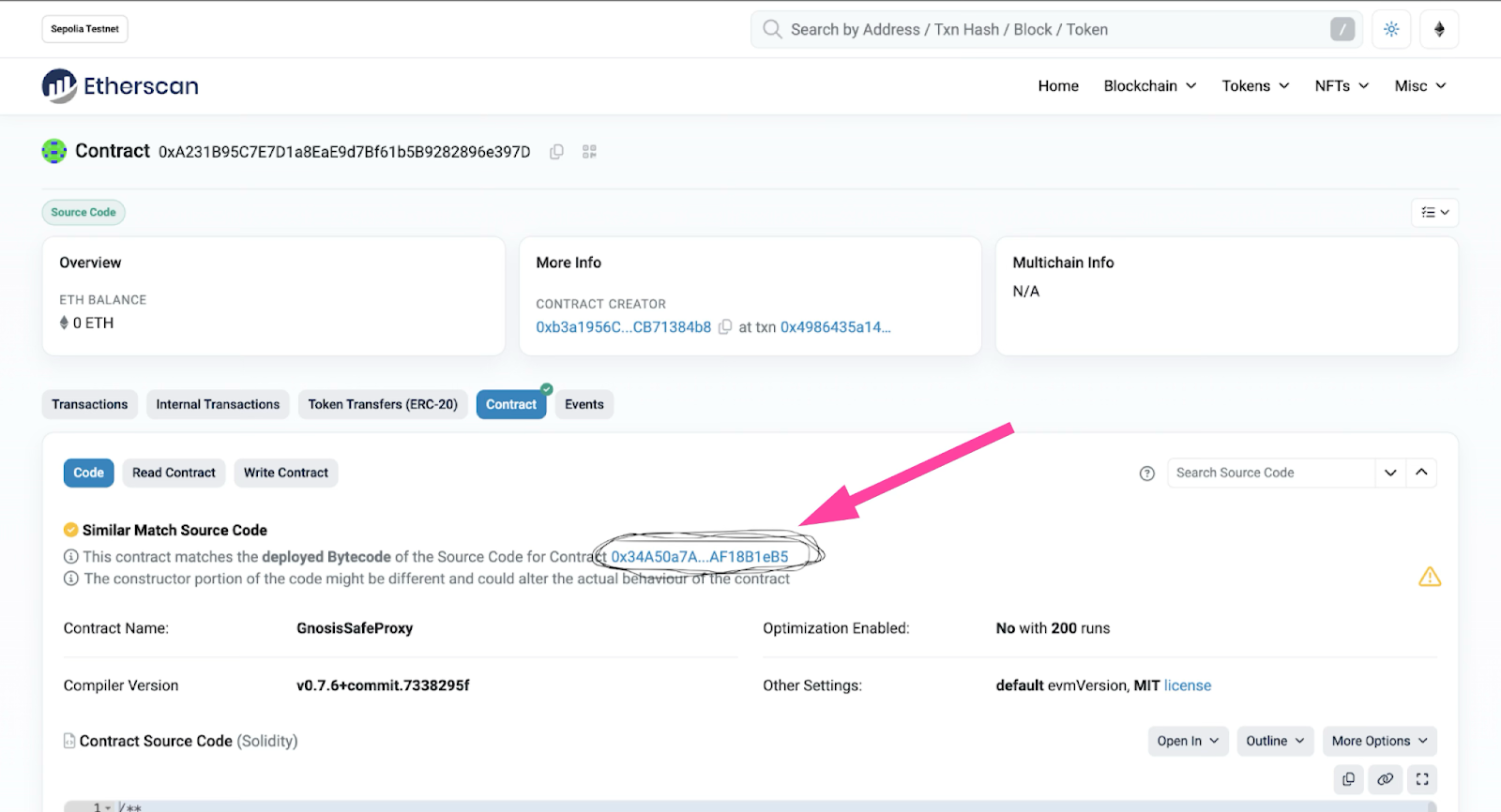 点击 Contract(合约) 标签,查看 GnosisSafeProxy 合约。
