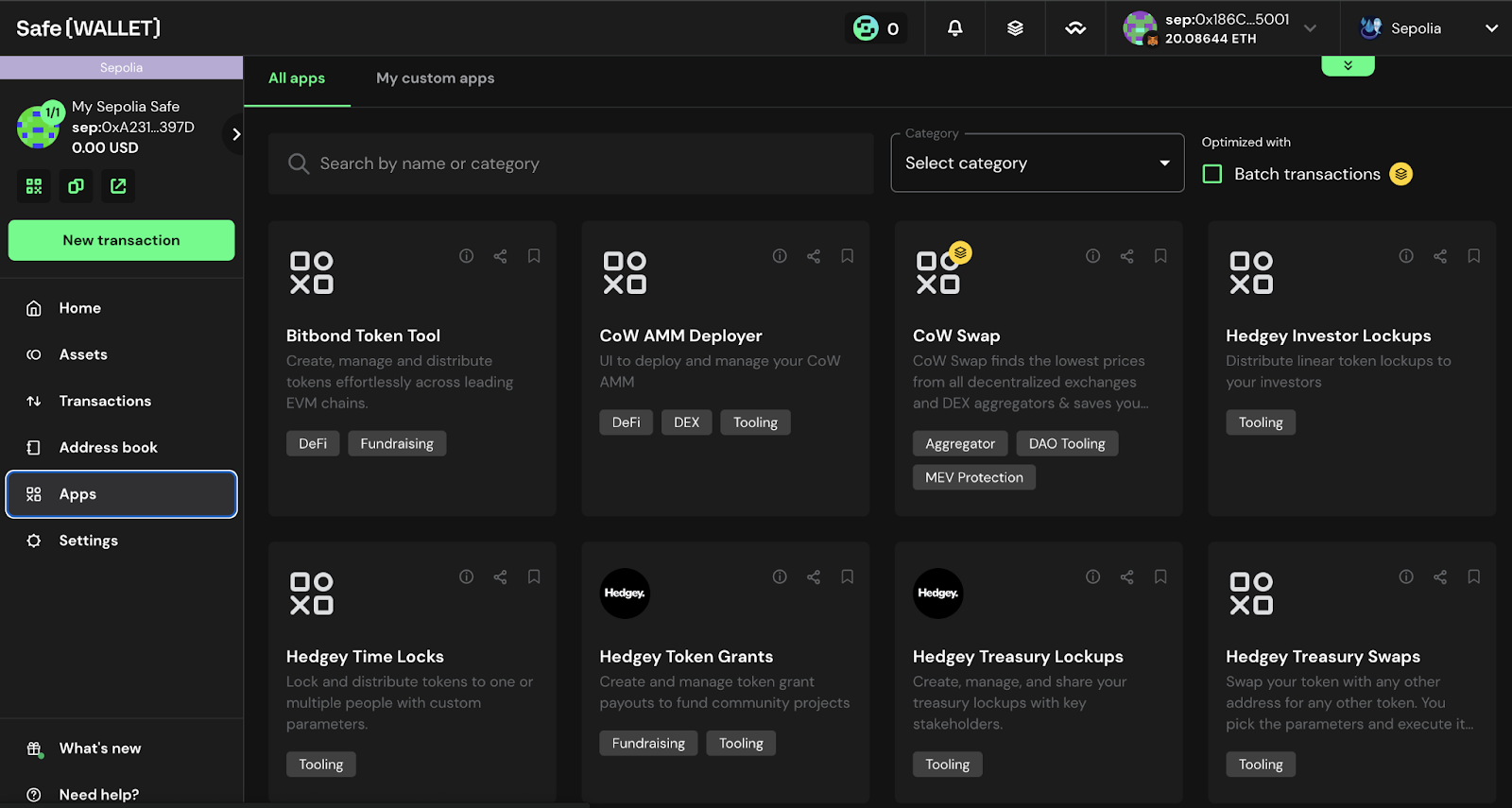 Safe 的用户界面提供多种功能。你可以直接连接 UI 中列出的应用,或通过 WalletConnect 连接未列出的应用。