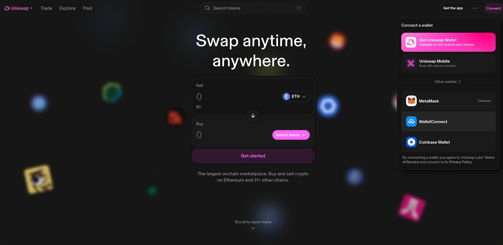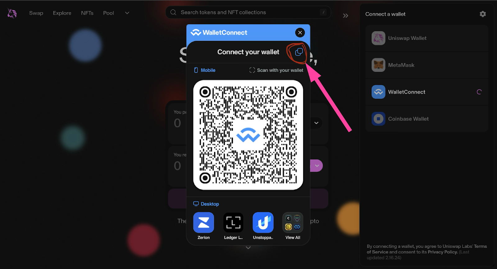 1.访问 Uniswap 网站,选择 WalletConnect 而非 MetaMask。