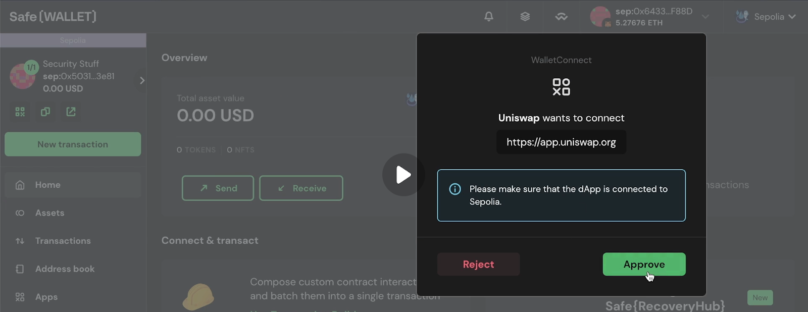 连接成功后,你的 Safe 钱包就与 Uniswap 关联了。其他应用也可依此流程操作。