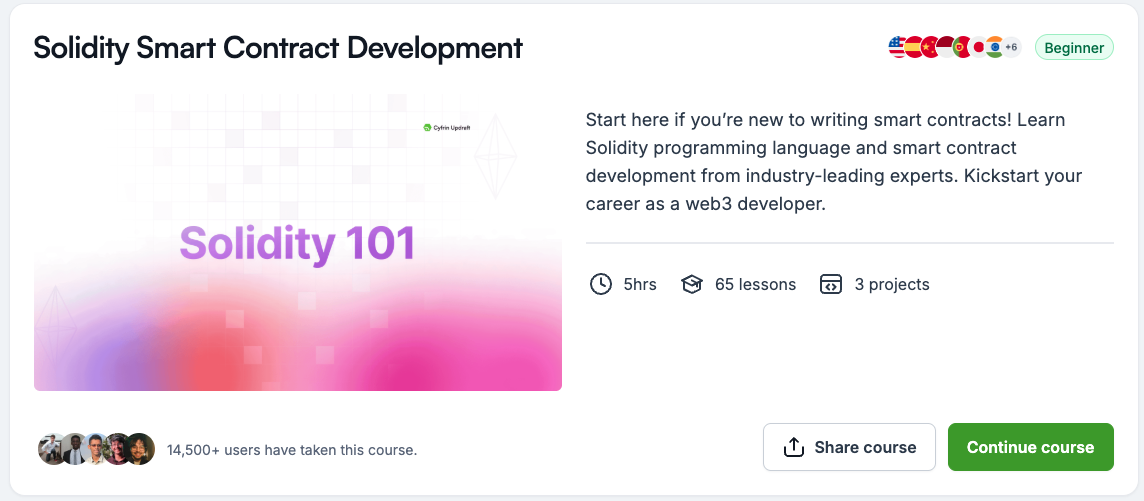 幸运的是,现在有许多优质的端到端 Solidity 学习资源,例如: