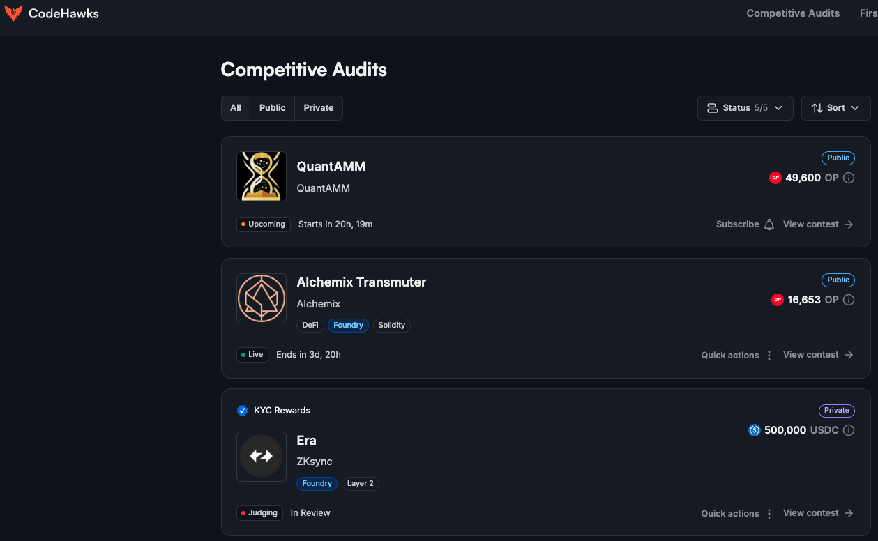 除了付费竞赛,CodeHawks 还提供 “First Flights” —— 这是专为新手设计的入门级审计任务,基于小型、简单的模拟协议,帮助你学习如何识别各类漏洞。如果你连 First Flights 中的一个漏洞都找不到,建议继续练习,再挑战正式竞赛。