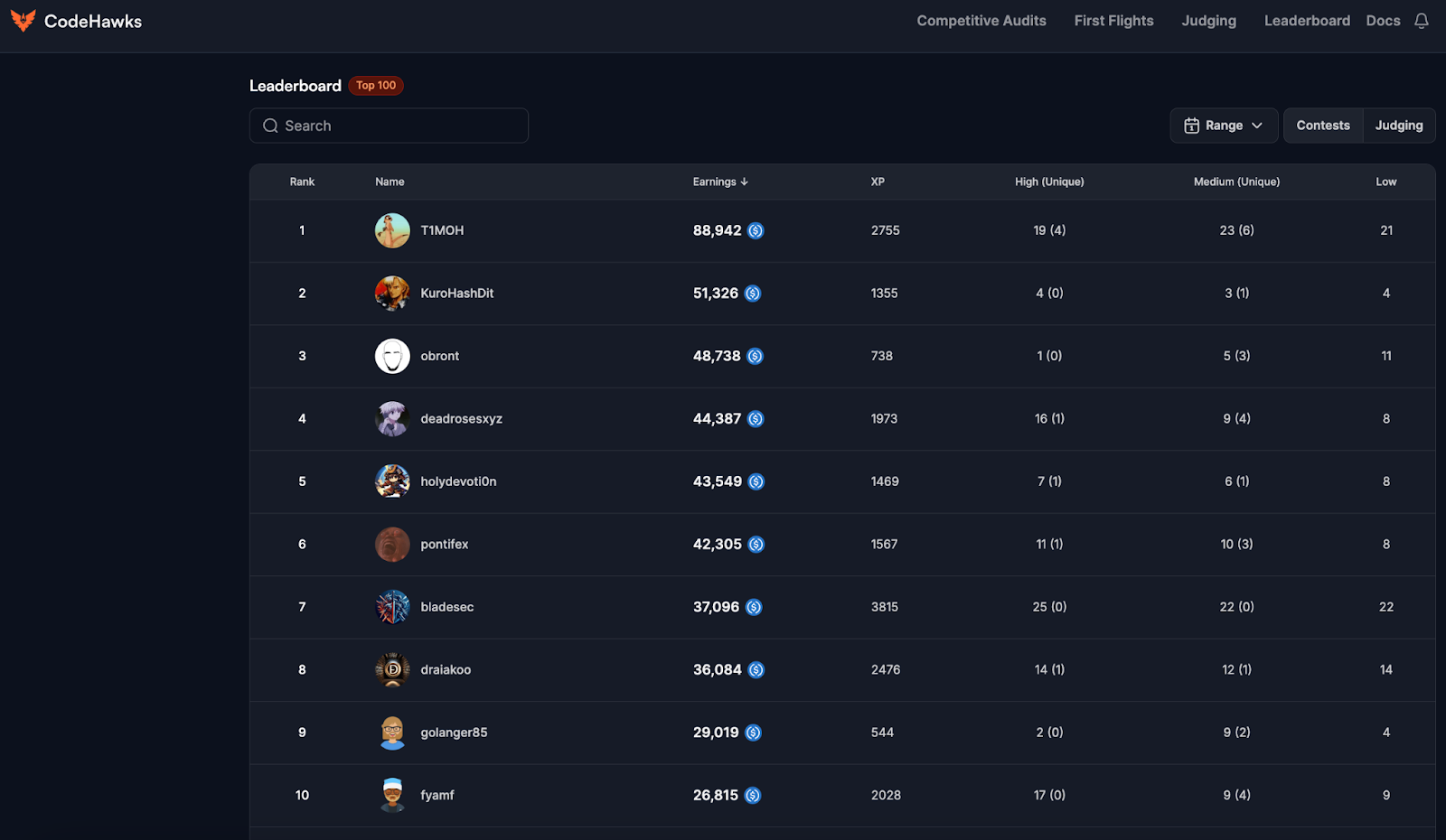 表现突出的审计员常被安全公司“挖角”录用。你甚至可以在 Solodit 等平台查看排行榜,了解其他审计员的表现。