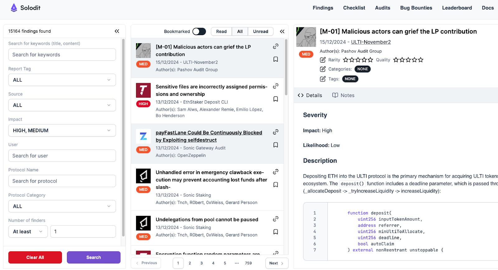 Solodit 将来自顶级安全公司、独立审计员和竞赛平台的漏洞发现汇总成一个可搜索的数据库/界面,让你随时了解当前社区正在报告哪些类型的攻击。这样,你就能提前掌握新兴漏洞趋势,在竞争中占据先机。