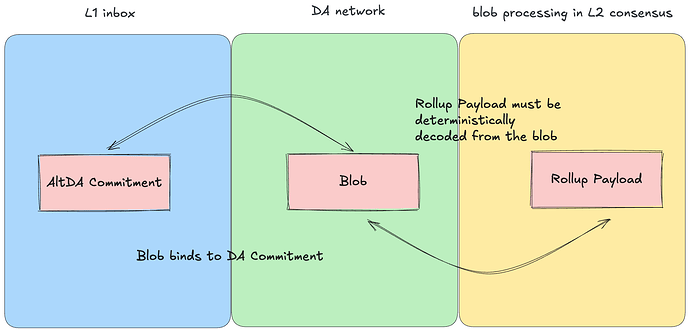 因此,DA 网络必须使用具有绑定性(binding),并且每个 L2 节点都必须验证其所检索到的 blob 是否确实与 AltDA 承诺中包含的承诺相匹配。