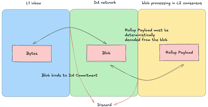 L2 共识按顺序处理 DA 承诺。对于每个承诺,它从 DA 网络中获取对应的 blob,并将其解码为 Rollup 载荷(rollup payload)。我们定义如下关键概念: