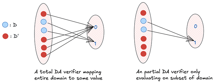 DAV 是定义在集合 ( S ) 上的一个函数:若对应的 blob 已被 DA 网络存储,则返回 1;否则返回 0。这将 ( S ) 划分为两个子集:( D )(DAV 返回 1)和 ( D' )(DAV 返回 0)。