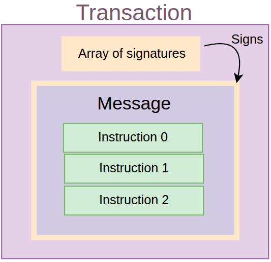 Solana 交易是一个包含两个字段的结构体:message(消息)和签署该交易的签名列表。消息中包含一个按顺序执行的指令数组。