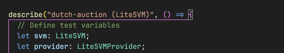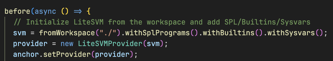 如上图所示,我们通过初始化 LiteSVM、创建 LiteSVM provider 并配置 Anchor 使用该 provider 来搭建测试环境。