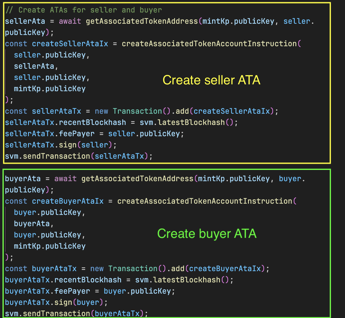 接下来,我们为卖家和买家创建关联代币账户(ATAs)。我们使用 getAssociatedTokenAddress()(从 @solana/spl-token 导入)推导账户地址,并使用 createAssociatedTokenAccountInstruction()(同样来自 @solana/spl-token)生成用于初始化这些账户的指令。