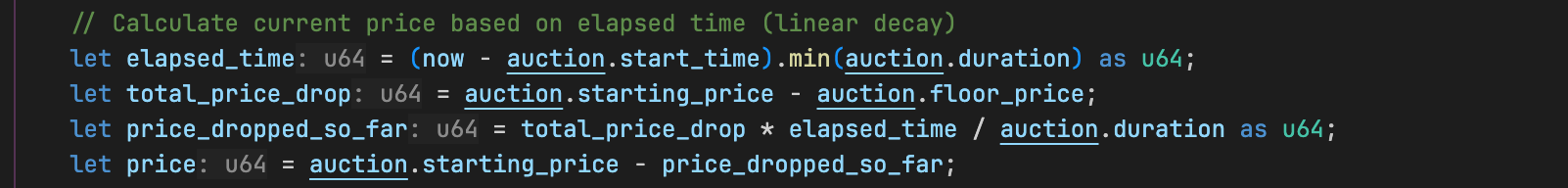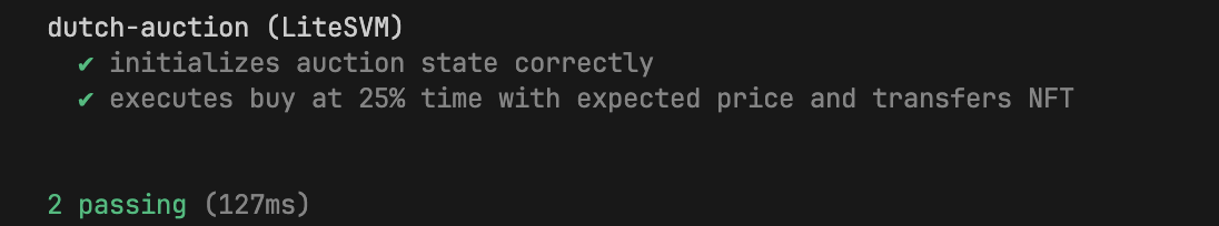 我们使用 litesvm(以及 anchor-litesvm)创建了一个本地测试环境,能够在其中快进时间。这使我们无需实际等待即可模拟 15 分钟的流逝,并确认拍卖价格从 2 SOL 正确下降至 1.625 SOL(即拍卖进行到 25% 时的预期价格)。