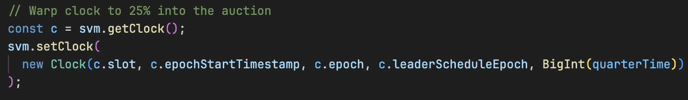 该方法接收一个 Clock 对象(从 litesvm 导入),我们将 unixTimestamp 设置为拍卖开始时间之后 15 分钟(由 quarterTime 定义)。这使我们无需真实等待即可测试价格衰减。