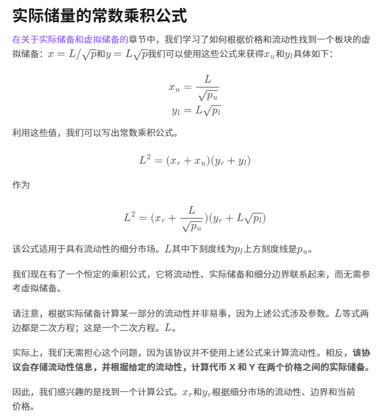 人们可能会问,常数乘积公式是否成立? 对于某个板块而言,可以用该板块的实际储备而非虚拟储备来表示。答案是肯定的。事实上,这个公式可以在 Uniswap v3 白皮书的第 2 页找到,如下所示(此处,x 和 y 表示实际储备,我们将其表示为