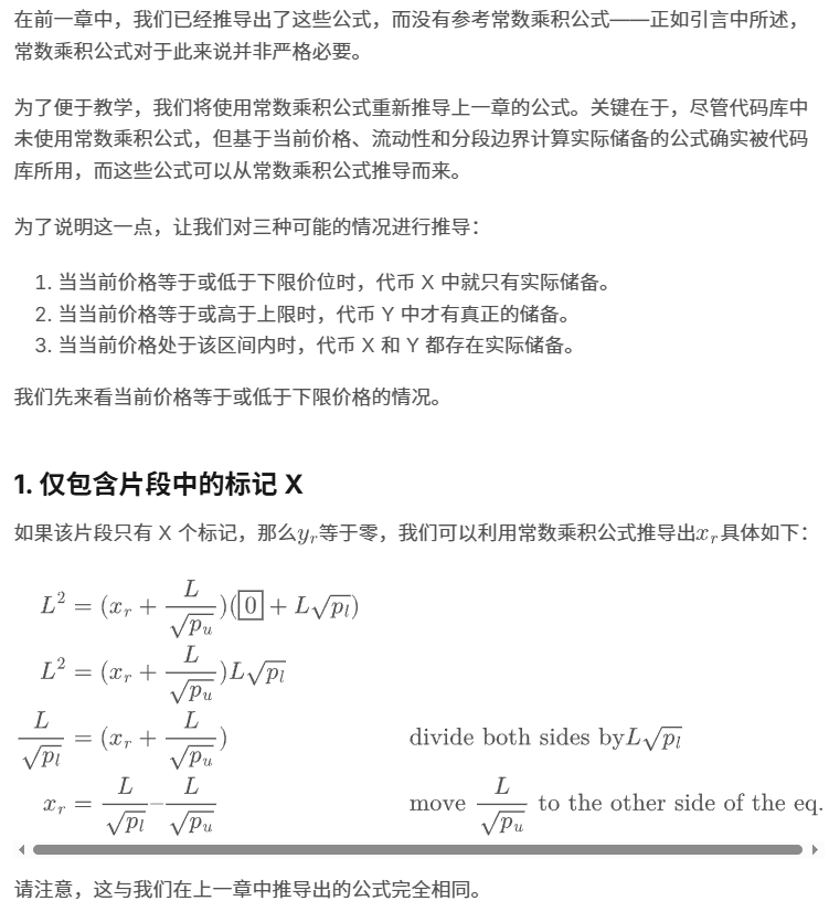 尽管如此,我们仍然可以利用常数乘积公式推导出实际储备与分段边界、流动性和当前价格之间的表达式。我们在前一章已经通过其他方法推导出了这些公式,因此本章内容为可选内容。